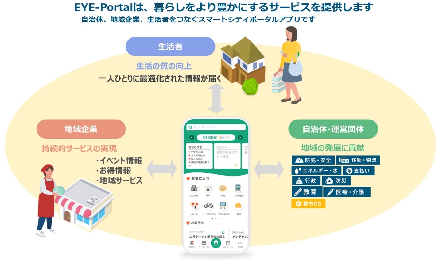 「EYE-Portal™」は、様々な情報やサービスを融合し、一人ひとりの生活に密着したサービスを提供できる、生活者と自治体・地域企業をつなぐスマートシティポータルアプリです。